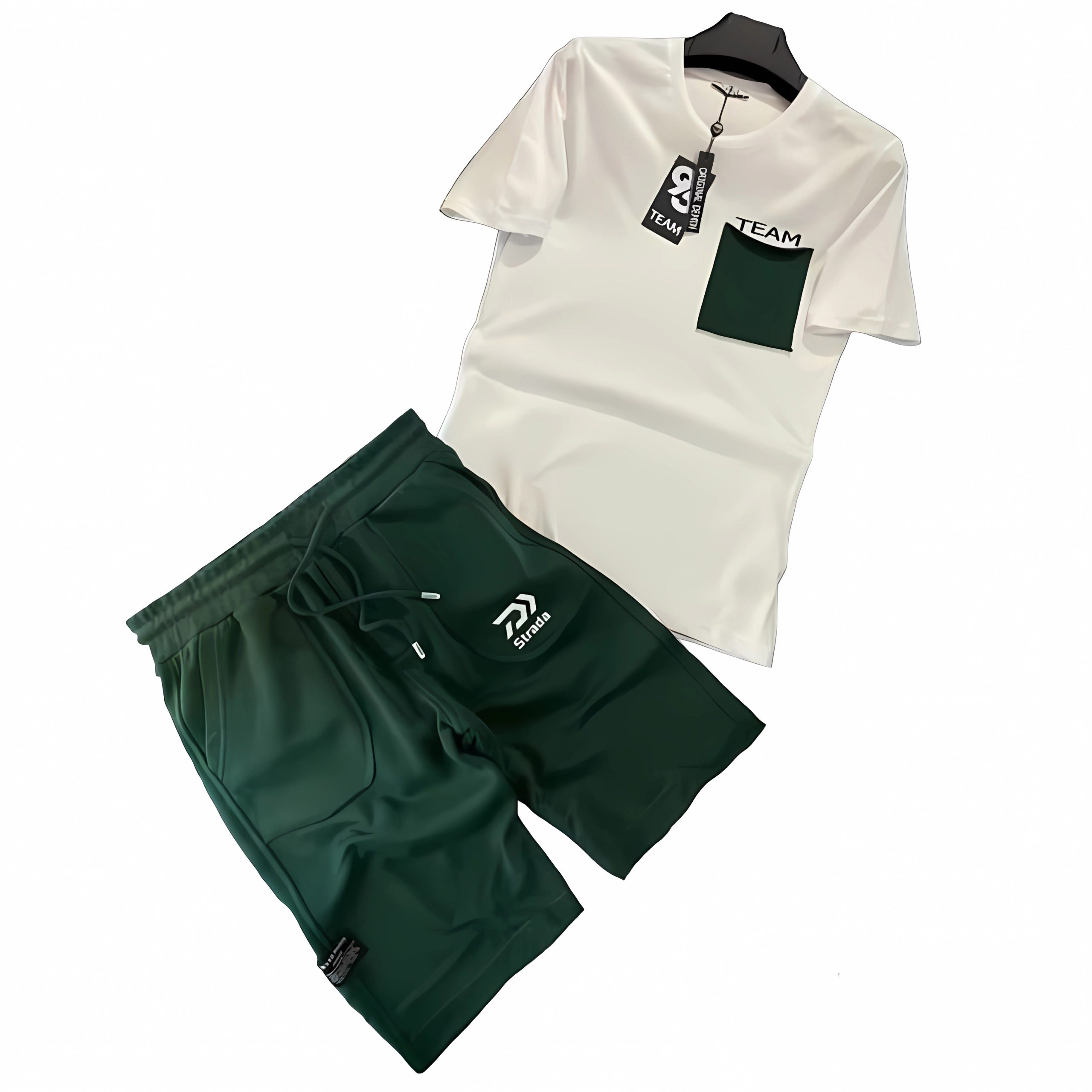 Le tenue comprend un t-shirt à col rond avec un short d’entraînement de couleur complémentaire.